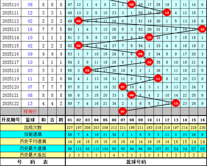 蓝球分析:小 号蓝球近期走势疲软,本期凝视小 号蓝球回补,参考蓝球01、02、06、07。