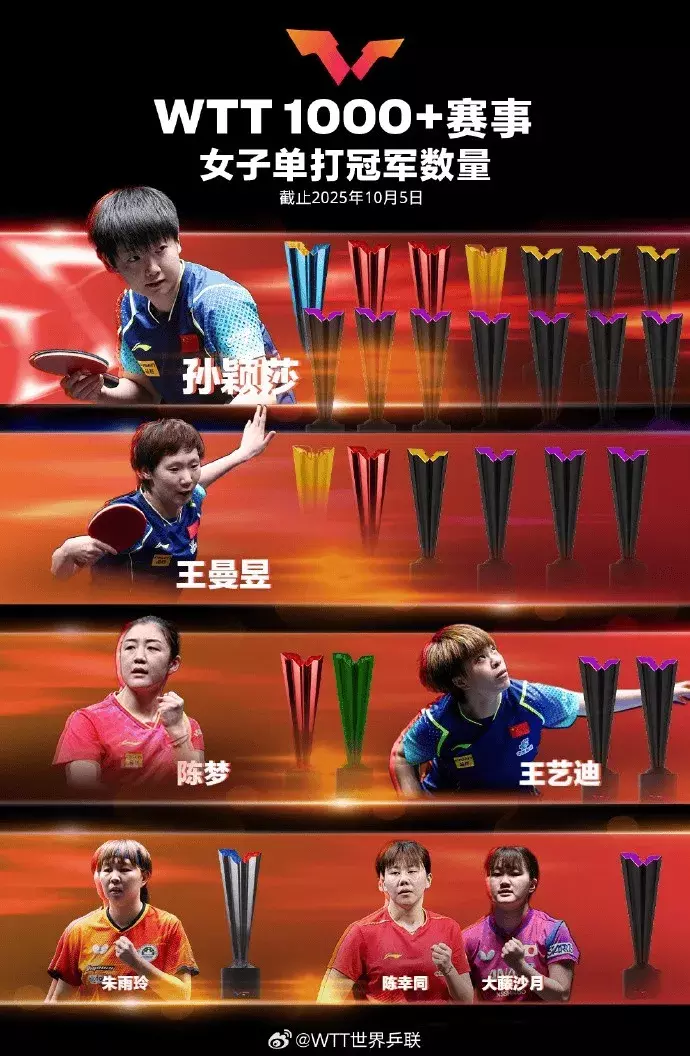 交易赛之王!WTT1000+赛事冠军榜:王楚钦、孙颖莎分列男女单第一!