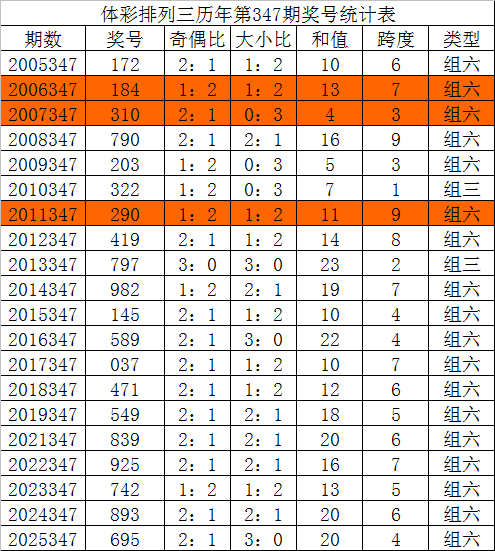 在积年陈设三第348期开奖中:组三号码出现9次,组六号码出现10次。组六号码开出比例略低,本期奖号方法看好:组六号码。