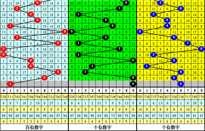 出现次数最少的三个号码别离为:0、6、9,本期预测这三个号码不会同期出现,放弃号码:0。